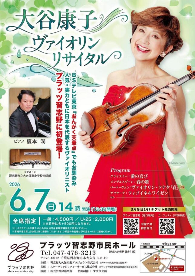 | 出演 | 大谷康子, violin 榎本潤, piano ゲスト: 習志野市立大久保東小学校合唱部, choir |